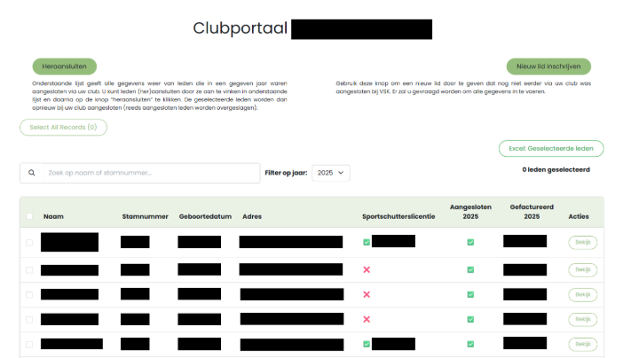 In het clubportaal vind je een overzicht van al jouw leden. Links naast de naam van elke schutter staat een wit vierkantje. Door hierop te klikken kun je een lid selecteren.