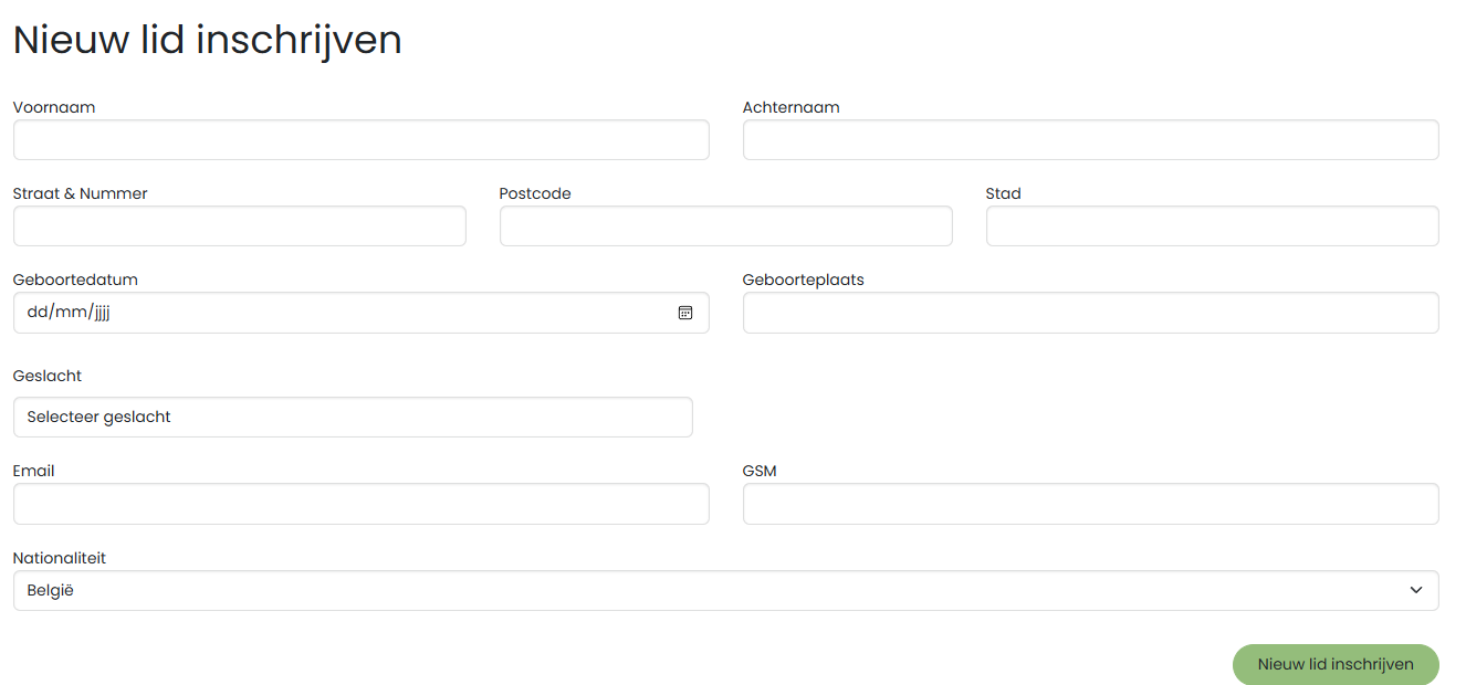 Wanneer je bent ingelogd op het portaal, zie je aan de rechterkant een groene knop "Nieuw lid inschrijven".